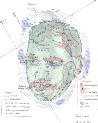 The northern part of Philippe Gonzalvez Island is taken up by the République de Cheveux (Hair Republic), bordered in part by the Fleuve Ride (Wrinkle River), beyond which lies the Fédération de la Face (Federation of the Face). Straddling both states are the Massif de la Calvitie (Mountains of Baldness) and Massif du Front (Mountains of the Forehead). The third state on the island is the Emirat de Barbe (Beard Emirate), mainly in the south. Its northern part is dominated by the Désert de la Joue (Desert of the Cheek).
