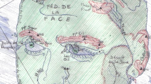 The Federation of the Face is dominated by three mountainous areas: Mont Sour and Mont Cil (sourcil is French for ‘eyebrow’), and the Chaîne de la Moustache (the Moustache Range). A fourth mountain range borders the eastern coast, beyond the Desert of the Cheek: the Chaîne du Lobe (the Earlobe Range). Just south of Monts Sour and Cil are two lakes: Lac Yeux and Lac Œil (œil, plural yeux, is French for ‘eye’), each containing an island – Île Pupille and Île Iris respectively.
