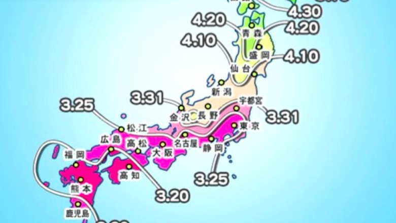 This is such a map, showing this year’s sakurazensen over the last and coming few weeks, colour-coded to reflect the transition of greens to pinks that accompanies the blossoming of the hanami.