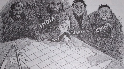 A youngster in breeches and an elderly man with a scythe, both white and together looking rather vulnerable, are playing dice against a team of unreliable-looking Asians. The object of their Great Game is on the board — Australia.