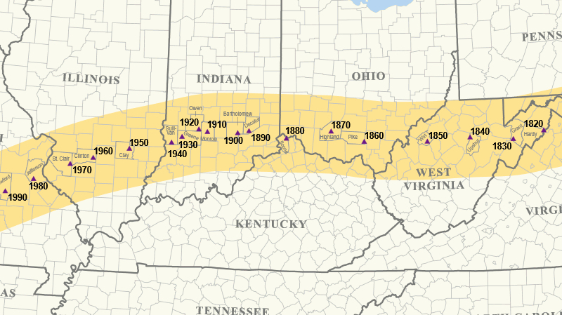 1790: 23 miles east of Baltimore (MD)1800: 18 miles west of Baltimore (MD)1810: 40 miles northwest by west of Washington, DC1820: 16 miles east of Moorefield (VA, now WV)1830: 19 miles west-southwest of Moorefield (VA, now WV)1840: 16 miles south of Clarksburg (VA, now WV)1850: 23 miles southeast of Parkersburg (VA, now WV)1860: 20 miles south by east of Chillcothe (OH)1870: 48 miles east by north of Cincinnati (OH)1880: 8 miles west by south of Cincinnati (OH)1890: 20 miles east of Columbus (IN)1900: 6 miles southeast of Columbus (IN)1910: in the city of Bloomington (IN)1920: 8 miles south-southeast of Spencer (IN)1930: 3 miles northeast of Linton (IN)1940: 2 miles southeast by east of Carlisle (IN)1950: 3 miles northeast of Louisville (IL)1960: 6-1/2 miles northwest of Centralia (IL)1970: 5 miles east-southeast of Mascoutah (IL)1980: 1/4 mile west of DeSoto (MO)1990: 10 miles southeast of Steelville (MO)2000: 3 miles east of Edgar Springs (MO)2010: 2.7 miles northeast of Plato (MO)
