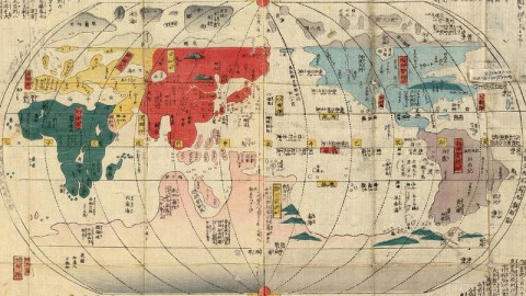 This Japanese world map circa 1850, gives an impression of the country’s view of its place in the world on the verge of its forced reintegration into the international community. It is an intriguing mix of foreign knowledge and native perspective.