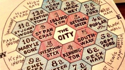 “John Leighton suggested that the old borough boundaries should be altered to conform to a honeycomb pattern. Within a 5-mile radius of the General Post Office all the sprawling, differently sized boroughs were to become hexagonal-shaped areas, 2 miles across. There were 19 altogether with the City in the centre of the honeycomb. Each hexagonal borough would be identified by a letter, and the letter as well as a number would be painted or cut out of tin-plate to be visible by day and night on lampposts at every street corner.”