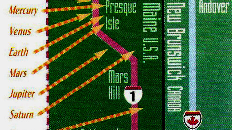 Where the sparse, rolling landscape of northern Maine can get a bit monotonous, some relief is provided by the Maine Solar System Model (MSSM). The MSSM, constructed in 2000 by the University of Maine at Presque Isle (UMPI), is the fourth-largest solar system model in the world (3). It is centred at UMPI’s Folsom Hall, which houses the Northern Maine Museum of Science. The scale is 1 to 93 million, which means that one Astronomical Unit (AU) equals one mile (1.6 km). All of our system’s planets are located along US Route 1, in order to present drivers with the opportunity to get a feeling of the scale of our solar system. Its original length was about 40 miles (64 km), all the way to Pluto, at the Tourist Information Centre in Houlton.