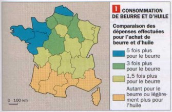 Map [1] compares the household money spent on butter and oil; with most money spent on butter in the north and west (blue) and most spent on oil in the south (light orange).