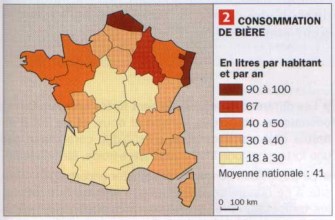 Map [2] shows between 90 and 100 litres of beer per inhabitant imbibed in the north and east, with less than half of that in most of the country, but especially in the south. See the entry on Europe’s alcohol belts (#442) for a similar take on regional differences in alcohol consumption.