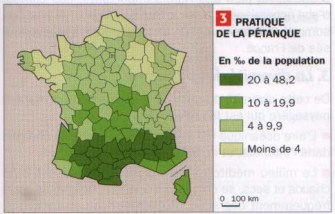 Map [3] reveals how many members pétanque clubs have per thousand inhabitants. The game was conceived in Provence, and its name derives from the Occitan pès tancats, meaning ‘anchored feet’. In keeping with its southern origin, it is 10 times more popular in the Occitan swathe across the south of France than in the north, northeast and northwest.