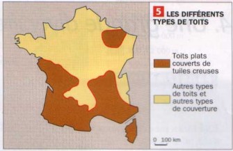 Map [5] charts the dominant roof type throughout much of the south (and, surprisingly, in the northeast): flat roofs with curved tiles.