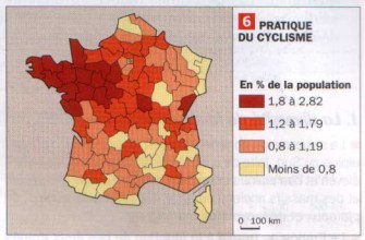 Map [6] details the popularity of bicycle clubs. The sport of the Tour de France is most popular in Brittany, but also adjacent areas inland (darkest red), and quite popular throughout most of central and northern France (orangey red). The areas least likely to cycle are scattered throughout the north, northeast, east, southeast, and south.