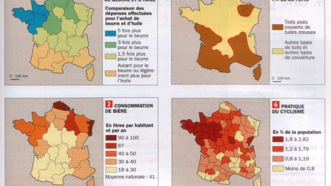 And yet in some ways France remains a very unhomogenised country. “These maps illustrate the perdurating cultural diversity of contemporary France, in spite of a long-time process of cultural unification,” writes Olivier, who sent in these maps from Tours (capital of département number 37, Indre-et-Loire).