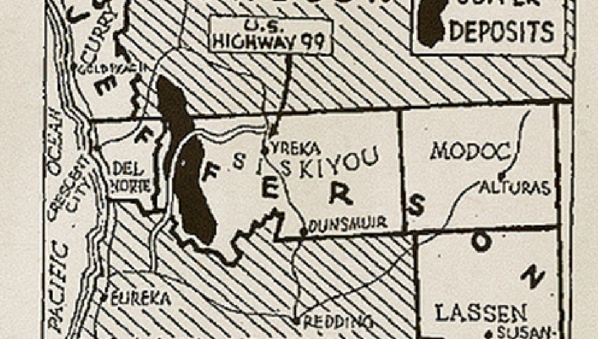 The proposal pertaining to the area portrayed in this map was first formulated in October 1941. As is often the case with border areas, both sides of the California-Oregon line felt neglected by their respective state governments. It was in fact the dismal condition of the state roads on either side of the border that pushed Gilbert Gable, mayor of the small coastal town of Port Orford, to announce the creation of a new state.