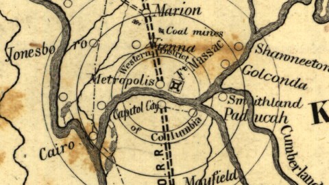 This map, drawn up by a William McBean, projector, identifies a circular area on both the Kentucky and Illinois banks of the Ohio river, not far from its confluence with the Mississippi at Cairo, as a so-called Western District of Columbia. The legend of the map “of a part of the SOUTHERN & WESTERN STATES” (4) mentions historic Fort Massac, which would probably have been the centre of the mentioned “WESTERN ARMORY” and places it next to the city of Metropolis, across the river from Capitol City. Those names sounded sufficiently grand for what was judged (or gambled) to be “the probable future site for the seat of Government of the UNITED STATES or Western District of Columbia etc.”