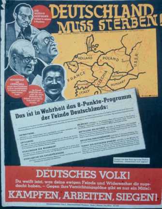 “Here is the truth about the 8 Points Programme of Germany’s enemies”, the title of the white text box reads. Those points being: disarmament, expropriation, sterilisation of the Wehrmacht, sterilisation of the civilian population, slavery, dismemberment of the Reich, limitations on residency, abolition of the German language. The text in the red box at the bottom reads: “German people! Now you know what your eternal enemies and opponents have thought out for you – against their plans for your extermination, there is only one possible course of action: fight, work, win!”
