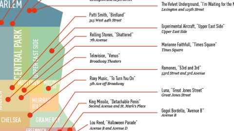 A musical topography like this requires relatively precise references – out goes Sinatra’s New York, who remains vague as to exactly where he wants to be “part of it”. That precision enables the pinpointing of artistic hotspots. The lyrical references by Sonic Youth, Leonard Cohen and Santigold on this map are relatively isolated in SoHo and the Lower East Side; the East Village boasts four references on a much smaller surface.