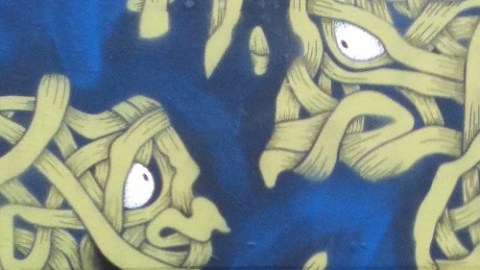 Schade’s work is very, well, ribbony. A portrait of Marilyn Monroe on another wall is reminiscent of one of M.C. Escher’s lithographs. This map is equally ribboned, but also animate, giving the whole an eerie feel, as if the islands had their skin flayed to be put up in a cartographic version of the rather creepy Bodyworlds exhibition.