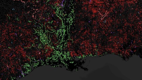 Pennsylvania, Maryland, northern Virginia, West Virginia and Ohio are dominated by the run (pink), while branch and fork (darker and lighter red respectively, and not easily distinguishable) dominate much of the South. One glaring exception is the lower Mississippi valley and the Gulf coast, centred on New Orleans, where the bayou (dark green) holds sway, reflecting French settlement.