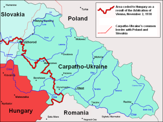 When in 1938 Nazi Germany annexed the Sudetenland parts in the west of the country, thus weakening the integrity of the Czechoslovak state, Transcarpathia (and Slovakia) demanded and got more autonomy. The region renamed itself Carpathian Ruthenia, and in november 1938 changed its name again into Carpatho-Ukraine.