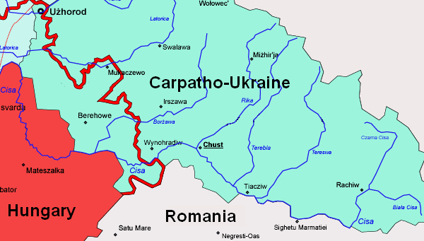 Update: Many thanks to Ian Mansfield for sending in this link to an article in The Economist, giving some extra background to Carpatho-Ukraine. The article contains this map, giving some extra geographical context to the area’s location.