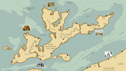 New Penzance takes up a central location on the map. The island consists of a n elongated land mass, oriented southwest to northeast, with a large, north-facing, double-headed promontory bolted onto the middle. The easternmost point is named as Cape Cooper, on a small cape between it and the large promontory lies Summer’s End, which features prominently in the film. Other locations on the island are Roman’s Ruins [5], near its centre, and Yeoman Lane, Vineyard Theatre and Berry’s Cottage near the unnamed, eastern cape.