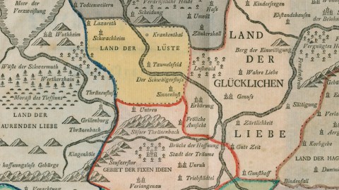 VerlangenauDesire TownUnruhUnrestStadt der TräumeCity of DreamsBrücke der HoffnungBridge of HopeUntreuDisloyaltySüsser ThränenbachSweet River of TearsTriebstädtelLittle Town of InstinctsMap found here at the Newberry Library.
