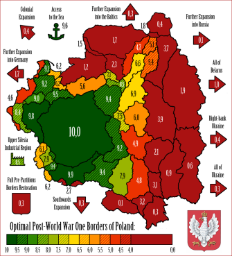 So: what would an ideal Poland have looked like? That depends on your definition of ideal, of course: the best borders from a military/strategic point of view? From an economic/industrial standpoint? Or should one opt for the most ethnically homogenous territory? Or perhaps choose borders grounded in the history of the Polish-Lithuanian Commonwealth?