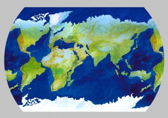 Colour codes are relative, as shown by our immediate re-interpretation of them in the ‘downside up’ version. Here, the continents are the different hues of grass, from green to dry; the ocean is navy blue and it’s the South Pole that is frozen, while the North Pole has reverted to open water. In this map, the longitudes of Europe and Africa retain retain the centrality that they are traditionally accorded in Western cartography, while East Asia and the Americas are pushed to the edges.