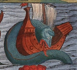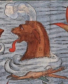 B – This is a rude ilk of great monster called Pristis or Physeter, mentioned by Solinus and Pliny. It rears up its head, spouts water into the ships and thus sinks and drowns them.