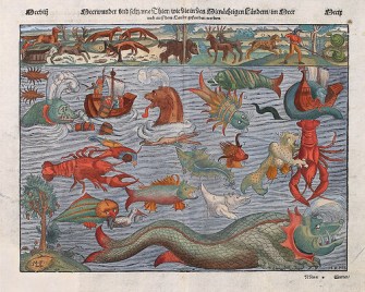 A few years after Olaus Magnus’s map, another catalogue of cartographic monsters hit the presses: an image in Sebastian Münster’s Cosmographia (1545) of ‘Wonders of the sea and rare animals, as they are found in the midnight lands in the sea and on the land’ [7].