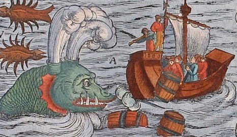 A – Whale fish as big as mountains are seen around Iceland. If they are not scared away with trumpet calls or jettisoned barrels, with which they gambol, they turn your ships over. It also happens that seamen assume to approach an island, in fact a whale, cast anchor, and are in a pretty pickle then. Such whales they call troll whales, i.e. devil whales. In Iceland people build their houses with the bones and fishbones of such big whales.