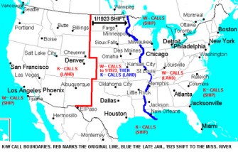 The general K/W map taken here from Media Heritage, a website ‘Preserving Radio and Television History’. The map of the border switch to the Mississippi taken here from Grilling Addiction, ‘[y]our source for grilling tips, tricks, techniques and recipes all year round’. The overview of anomalous call signs taken here from Mr. White’s United States Early Radio History, ‘Articles and extracts about early radio and related technologies, concentrating on the United States in the period from 1897 to 1927’.