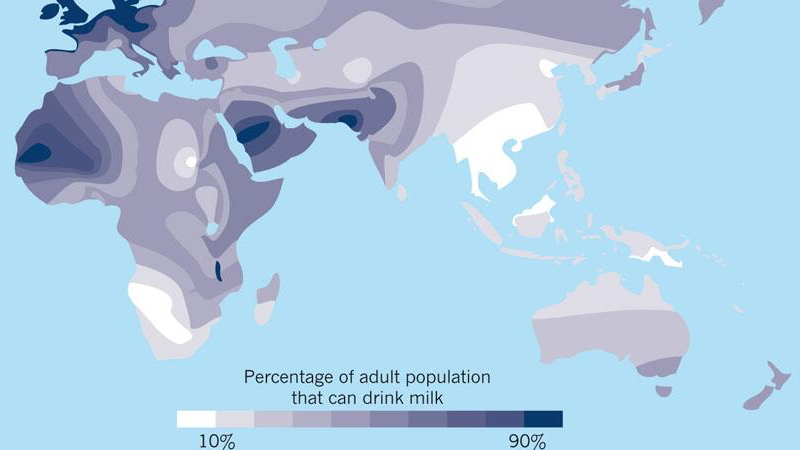 The ability to hold down milk is of course but one of many dietary factors that contributed to the evolutionary success of certain strains of humanity. Making the right choice as to which crops to grow, which animals to husband and which areas to explore all contributed to a tribe’s multiplication – or annihilation. But this map indicates that the milk factor, isolated and mapped out, can be a meaningful tool to interpret the ebb and flow of certain human migration patterns.
