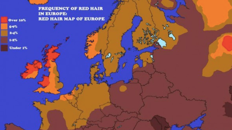 The geographic distribution of redheads across Europe is equally puzzling, as this map demonstrates. There are two ginger hotspots: the Celtic fringe of the British Isles (i.e. Scotland, Ireland and Wales), and an area deep inside Russia, somewhere between Yaroslavl and Kirov.