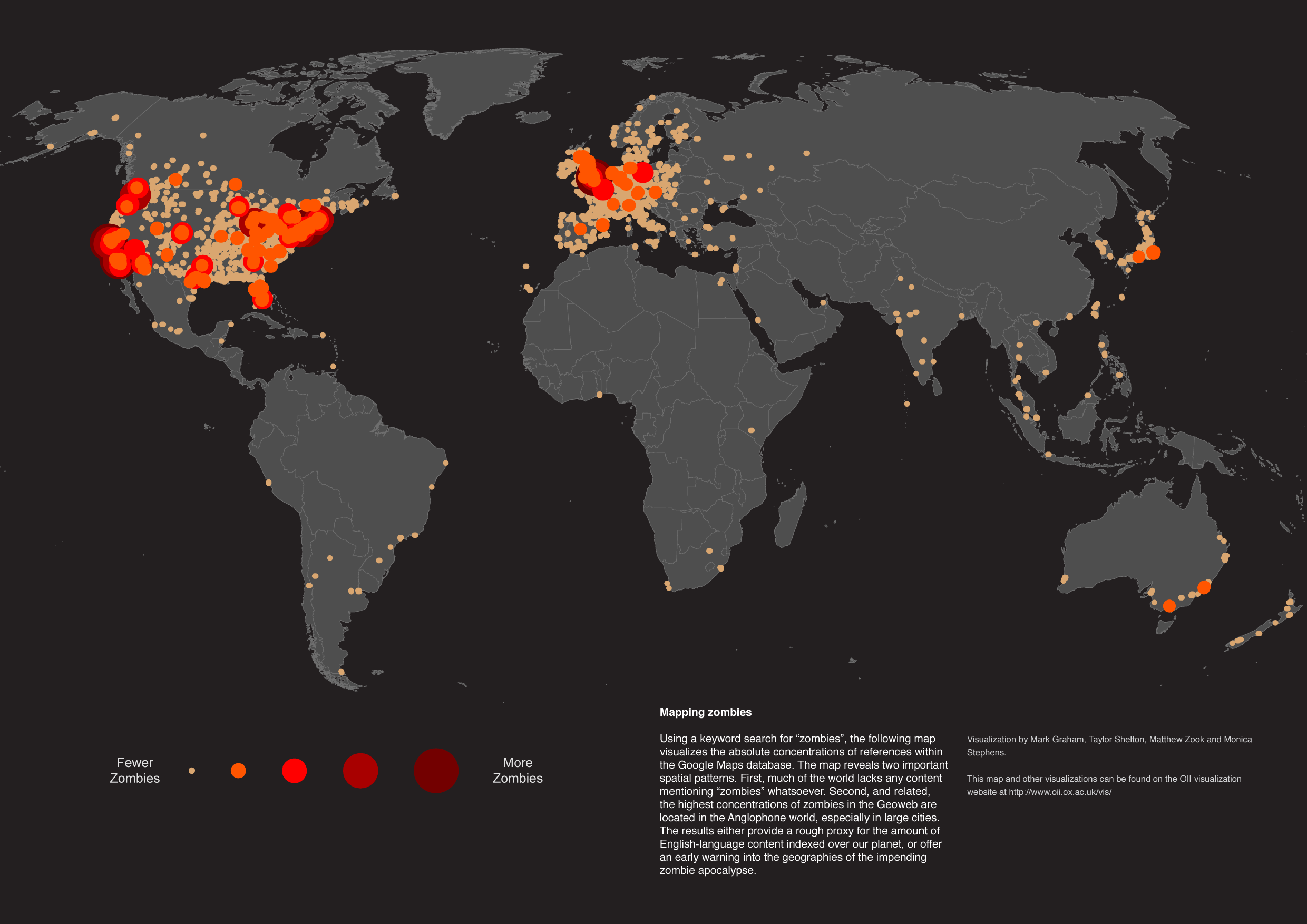 Many thanks to Robert Farkas, who made and sent in the Walking Dead map (the non-Google Maps one). Thanks also to Alex Meerovich and Laura Wenham, who sent in the map for the 1866 outbreak, found here on io9. The last map, showing an epidemic of mentions of the word zombie, taken here from the Oxford Internet Institute at the University of Oxford.