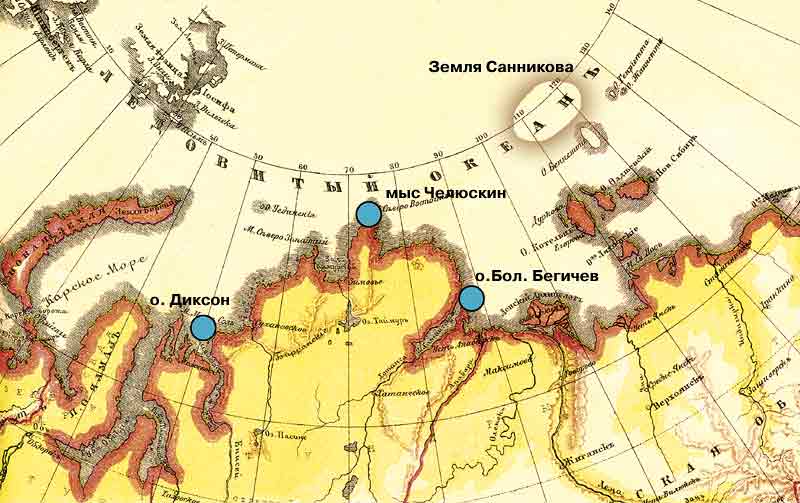 This Russian-language map, taken from the Alison Bridge website (an online allohistory game), shows the presumed location of Sannikov Land (indicated as Zemlya Sannikova in Cyrillic script) to the north of the New Siberian Islands, in the upper right hand side of the map. In between lies Bennett Island.