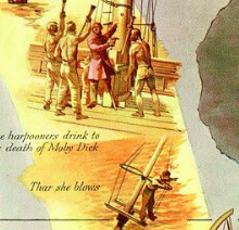 The story’s geographic progression is accompanied by illustrations of its narrative evolution. Early on, Captain Ahab convinces his crew of his particular mission (The harpooners drink to the death of Moby Dick), whales are sighted in the North Atlantic (Thar she blows), and the Captain’s strange confidant arrives (Fedallah and his yellow crew mysteriously appear).