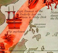 The map shows us the course of the Pequod, incidentally validating the map of 19th-century American shipping traffic, shown a few posts earlier. For the ship follows several of the densest datastreams on that map: setting out from New England, it plunges down the Atlantic Ocean, between West Africa and South America, to round the Cape of Good Hope and traverse the Indian Ocean in a northeasterly direction, passing between Java and Sumatra and past the Philippines into the Pacific Ocean, then sailing south to meet its doom somewhere off New Guinea.