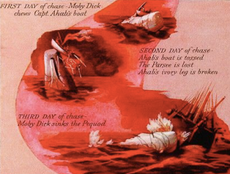 A cartouche then zooms in on the final stages of the story – the deadly encounter between the Pequod and the whale. On the FIRST DAY of chase – Moby Dick chews Capt. Ahab’s boat, while on the SECOND DAY of chase – Ahab’s boat is tossed; the Parsee is lost; Ahab’s ivory leg is broken. Finally, on the THIRD DAY of chase – Moby Dick sinks the Pequod. All go down with her, but Ishmael alone survives in the coffin canoe.