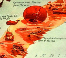 Fortunately, there is a map. And it does what maps do best: it shows us the way, reassuring us that even the longest voyages have an end as certainly as they have a beginning. The map’s title is The Voyage of the Pequod, showing the route of that ill-fated ship captained by Ahab, obsessed with exacting revenge on the white monster that took his leg on a previous whaling trip. Among its crew are the narrator Ishmael, his savage friend Queequeg, and Starbuck (who indeed lent his name to the coffee chain, after the initial proposal, Pequod, was rejected by some of the founders).