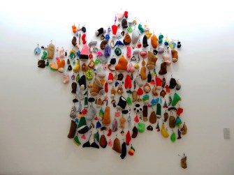 This is a work by the French artist Annette Messager. One of her recurrent themes is the ambivalence of childhood, that magical era of firsts. Never again will joy and terror be so fresh, so intense. It’s also a phase of life bounded by the comforts of innocence, and the thrills of experience. Not neatly separated, but intermingling. Hence the chopped-up teddies. But there’s a twist to the work, and the clue is in the cartographic form it represents – and in its title, the delightfully French expression: Faire des cartes de France.