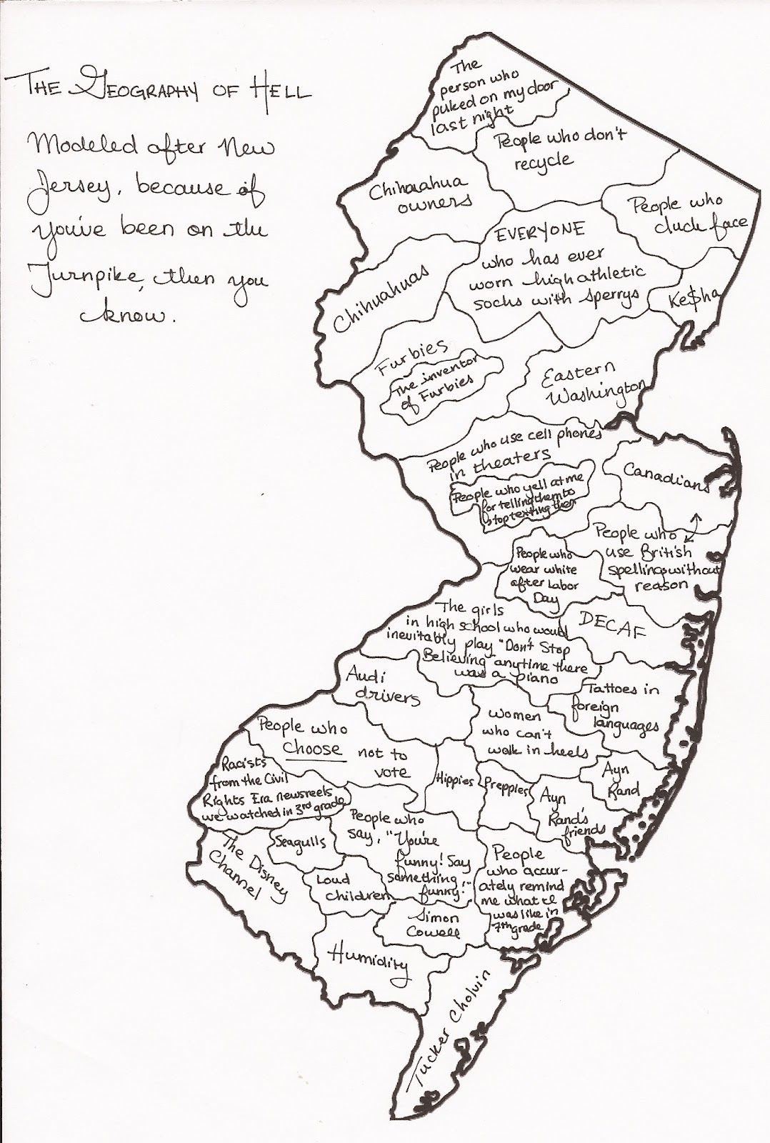 The unknown author of this fine map improves on Sartre’s dictum that ‘hell is other people’ by presuming that everybody who has ever annoyed him/her lives in the Garden State, from the person who puked on my door last night over people who wear white after Labor Day via hippies and preppies to the girls in high school who would inevitably play ‘Don’t Stop Believing’ anytime there was a piano, not to forget Simon Cowell. And even seagulls, poor things.