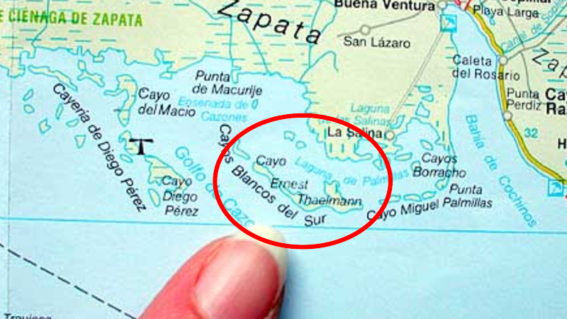 In a military exclusion zone in the Gulf of Cazones, not far to the south-west of the infamous Bay of Pigs, lies a small island formerly known as Cayo Blanco de Sur. The island is 15 km long, but never more than 500 metres wide (although another source claims it is 24 km long and 1 km wide). It is uninhabited but for the iguanas and birds that are indigenous there, and the occasional tourists stopping over. The area is very biodiverse, hosting several endangered species of fish and coral. The reefs make the island inaccessible to any but the smallest boats, and even then landing often involves wading ashore.