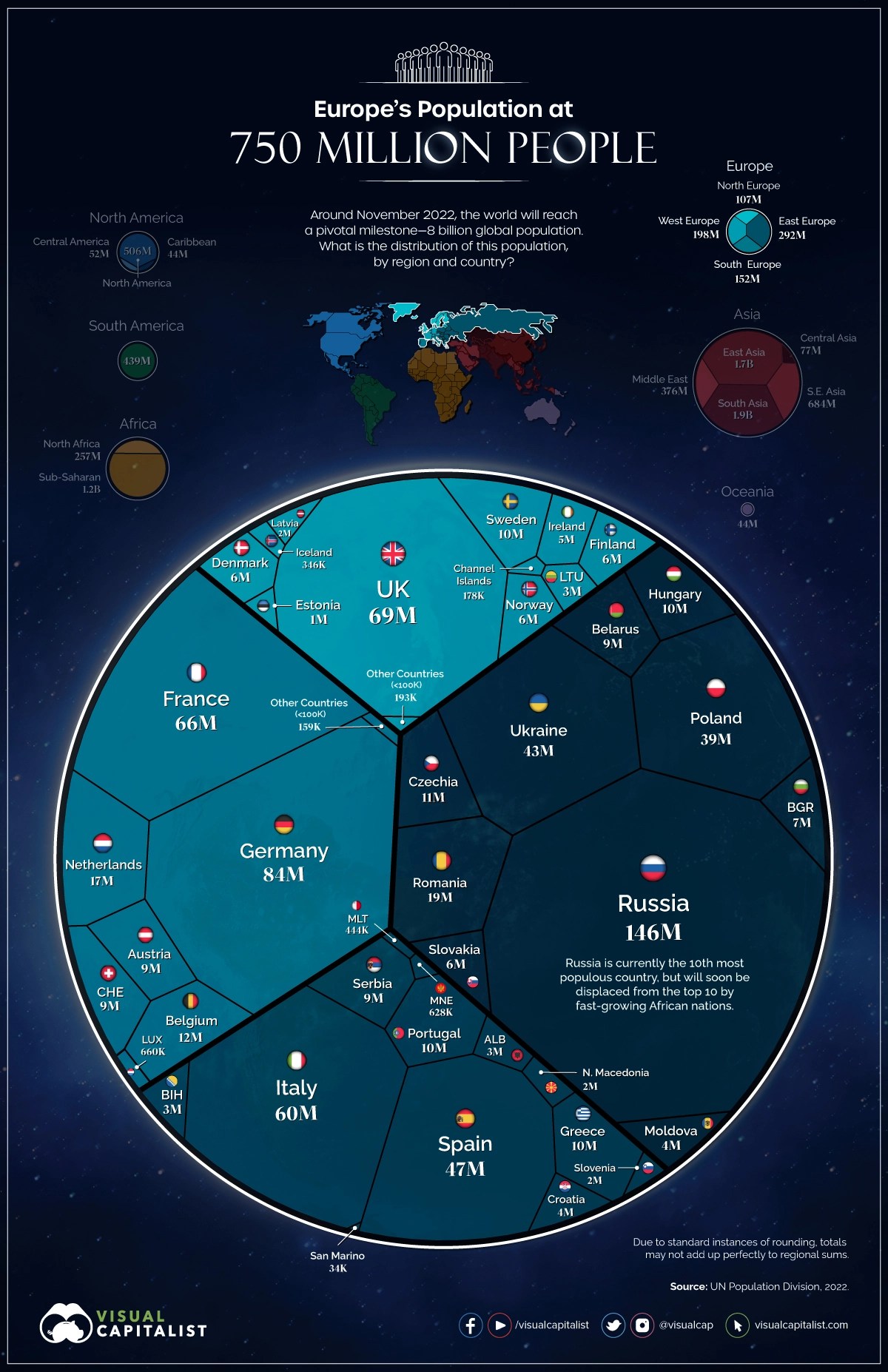 Russia (146 million) is Europe’s most populous nation, but not by as big a margin as China in Asia (or the U.S. in North America). Combined, Germany (84 million) and France (66 million) have more people. Those two countries represent most of Western Europe (198 million in total), as Italy (60 million) and Spain (47 million) dominate Southern Europe (152 million in total), and the UK (69 million) Northern Europe (107 million in total). Added up, these so-called “Big Five” countries represent 44% of Europe’s total population and the bulk of its economy.