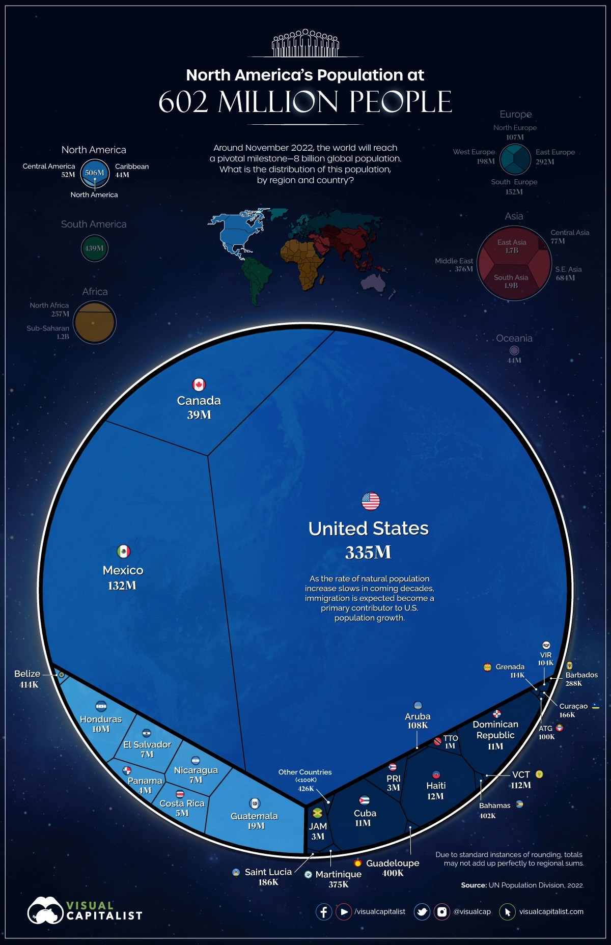 Representing well over half the continent’s population, the U.S. (335 million) dominates North America (507 million in total) — just as it does on a “normal” (geographical) map. For once, however, Mexico (132 million) is much larger than Canada (37 million). Guatemala (19 million) has the largest population in Central America (52 million in total), and Haiti (12 million) is the population superpower of the Caribbean (44 million in total), edging out Cuba and the Dominican Republic (both 11 million).