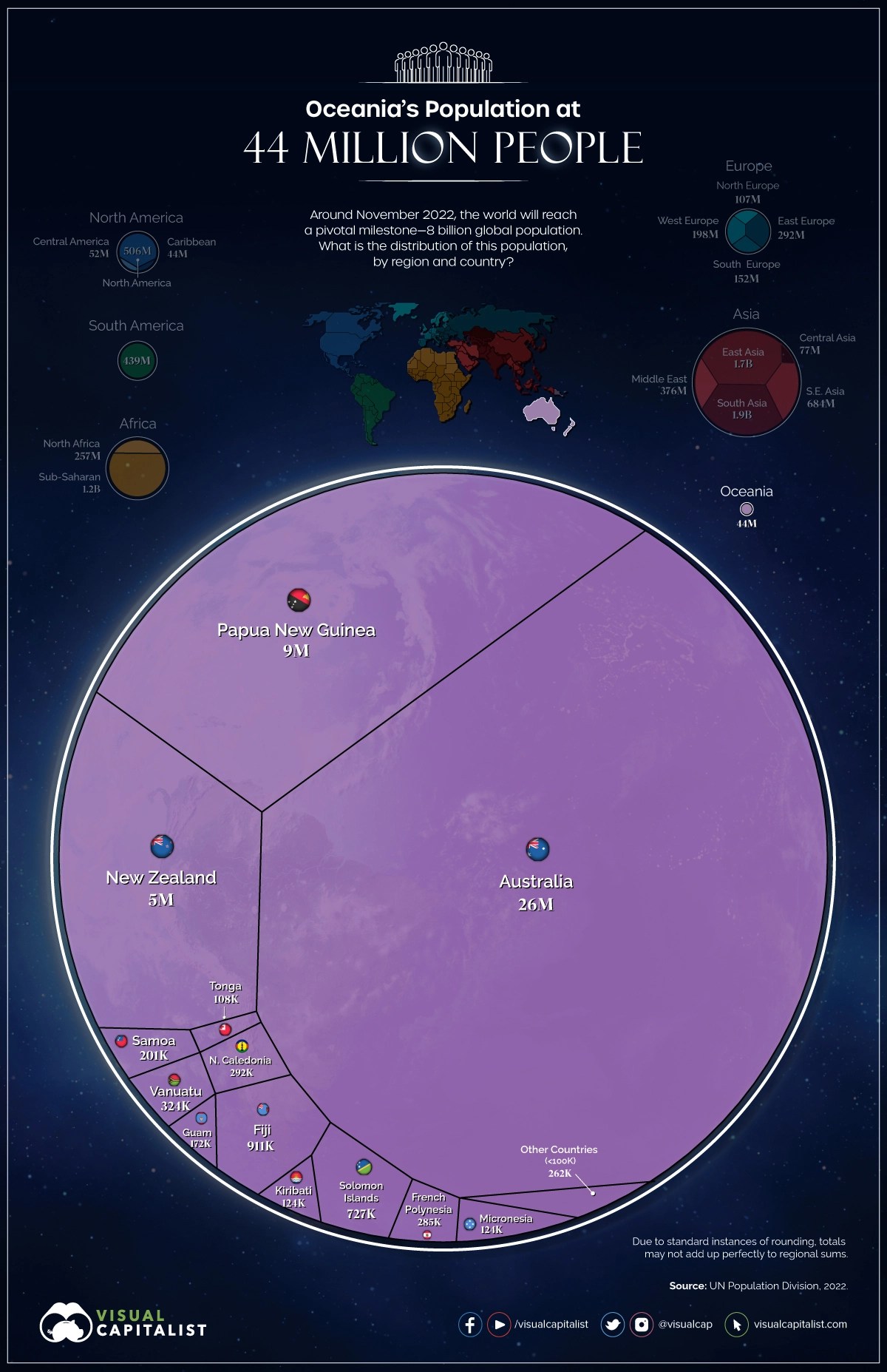 Oceania is the least populous continent (44 million, which is about as much as Greater Tokyo). In that little pond, Australia is the biggest fish (26 million, or close to 60% of the total). Second? Not New Zealand (5 million), but Papua New Guinea (9 million). No other Oceanian country or territory has more than a million inhabitants; Fiji (911,000) comes closest.