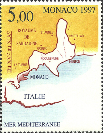 The map in the upper right corner shows the shrinkage which occurred in the nineteenth century. Monaco succeeded in tearing loose from Genoa and had its independent status confirmed by the King of France and the Duke of Savoy in 1489. But in the centuries that followed, the Grimaldis presided over a territory under increasing pressure from the consolidating nation-states surrounding it. From 1793 to 1814, Monaco was even occupied by revolutionary France.