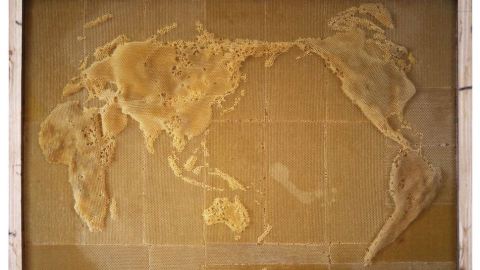 The oldest project, Yuansu I — The Origin of Geometry (2007-2011) consists of a series of beeswax maps. Ren Ri created these by making molds of the world and of various individual countries, placing them in the beehives. Upon removal a few months later, they revealed the honey-flavored topographies shown here.