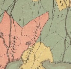 As on the islands, easily recognised topographic symbols denote mountains, lakes, and rivers. But the mainland is also crisscrossed by dotted lines, delimiting the coloured patches and smaller subdivisions within them. It’s perhaps not such a stretch to imagine that these lines refer to kingdoms and their provinces. And that those things that look like the male symbol (♂) but pointing straight up could refer to cities or towns.