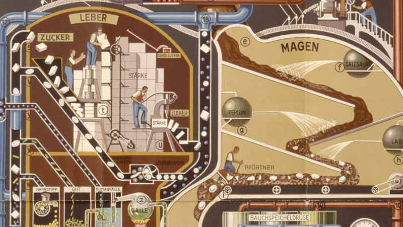 A fantastic array of shiny pipes and tubes, conveyor belts, and storage tanks make the lungs (Lunge), liver (Leber), stomach (Magen), kidneys (Niere), spleen (Milz), and other organs and glands look like the moving, clanking parts of a factory. Two main processes animate the workfloor: respiration, with the intake of oxygen (Sauerstoff) and the expulsion of carbonic acid (Kohlensäure); and nutrition, i.e., processing food (Nahrung) into ingredients that can be used to keep the factory humming and the lights burning.