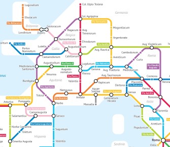 Those caveats being understood, it is a joy to use this ‘Tube map’ as a guide for imaginary travels across the Roman Empire, from Rome, the caput mundi (i.e. capital of the world) itself, to Eburacum (York) for instance. You take the Via Aurelia to Luna (a former city in Etruria), thence the Via Julia Augusta to Arelate (Arles, in France), then north on the Via Flavia I, switching to the westbound Via Flavia III at Cabillonum (Chalon-sur-Saône). At that road’s terminus in Gesoriacum (Boulogne-sur-Mer), you cross the Channel to Dubris (Dover), where you rush north on the Via Brittanica past Londinium for the last stretch.