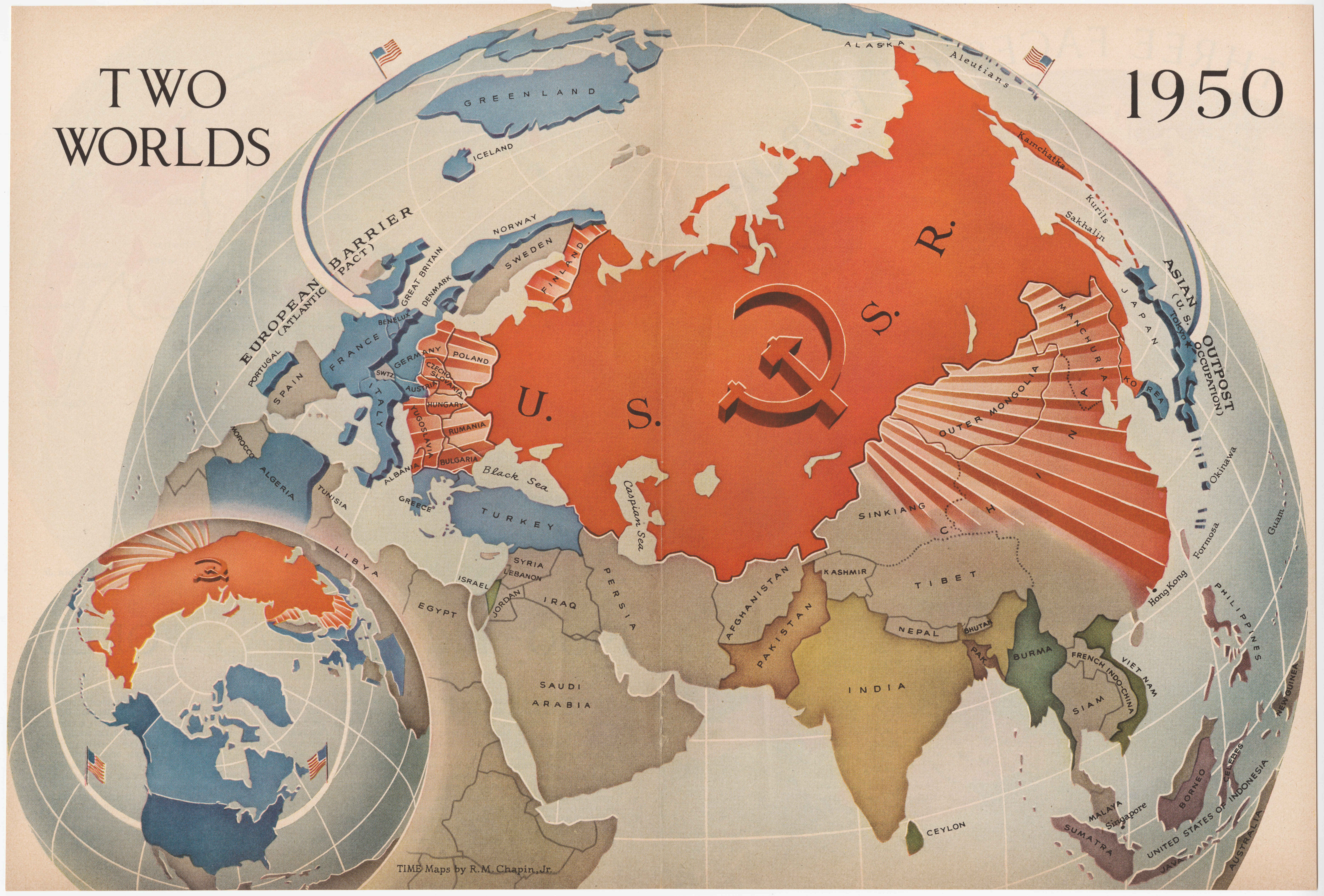 The map’s intention is clear: to impress on the American magazine-reading audience the strength and size of their ideological opponent in the nascent Cold War.